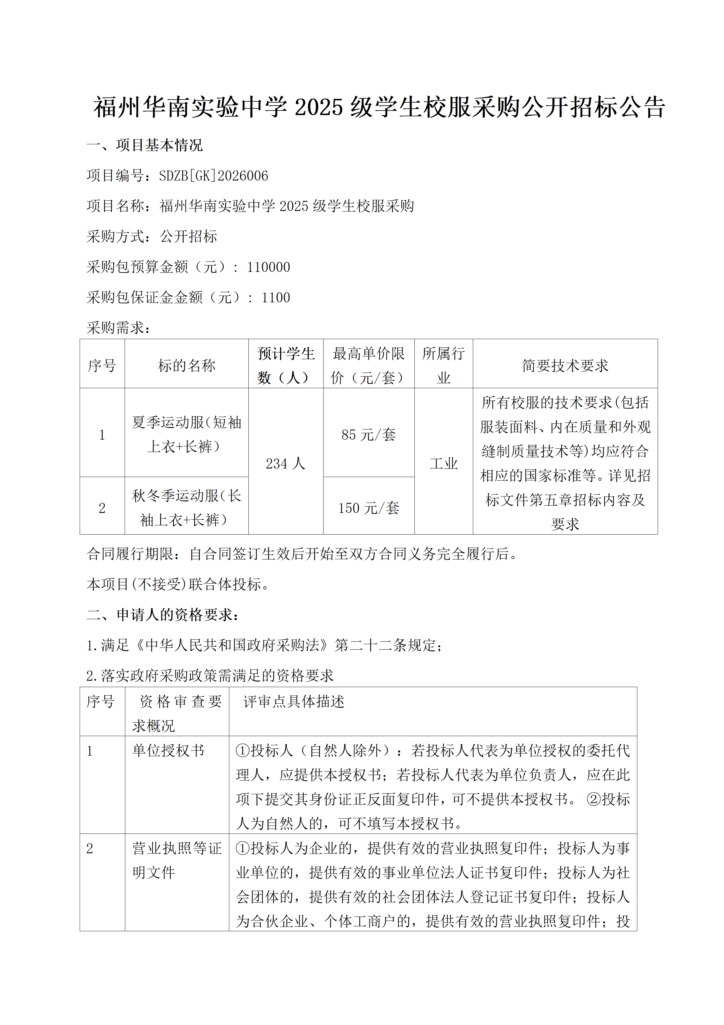 福州华南实验中学2025级学生校服采购公开招标文件.docx