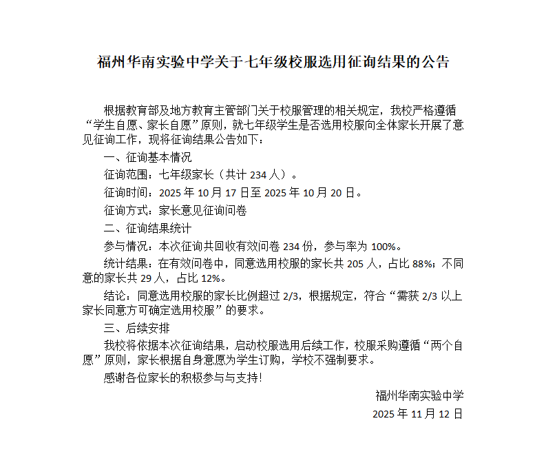 福州华南实验中学关于七年级校服选用征询结果的公告