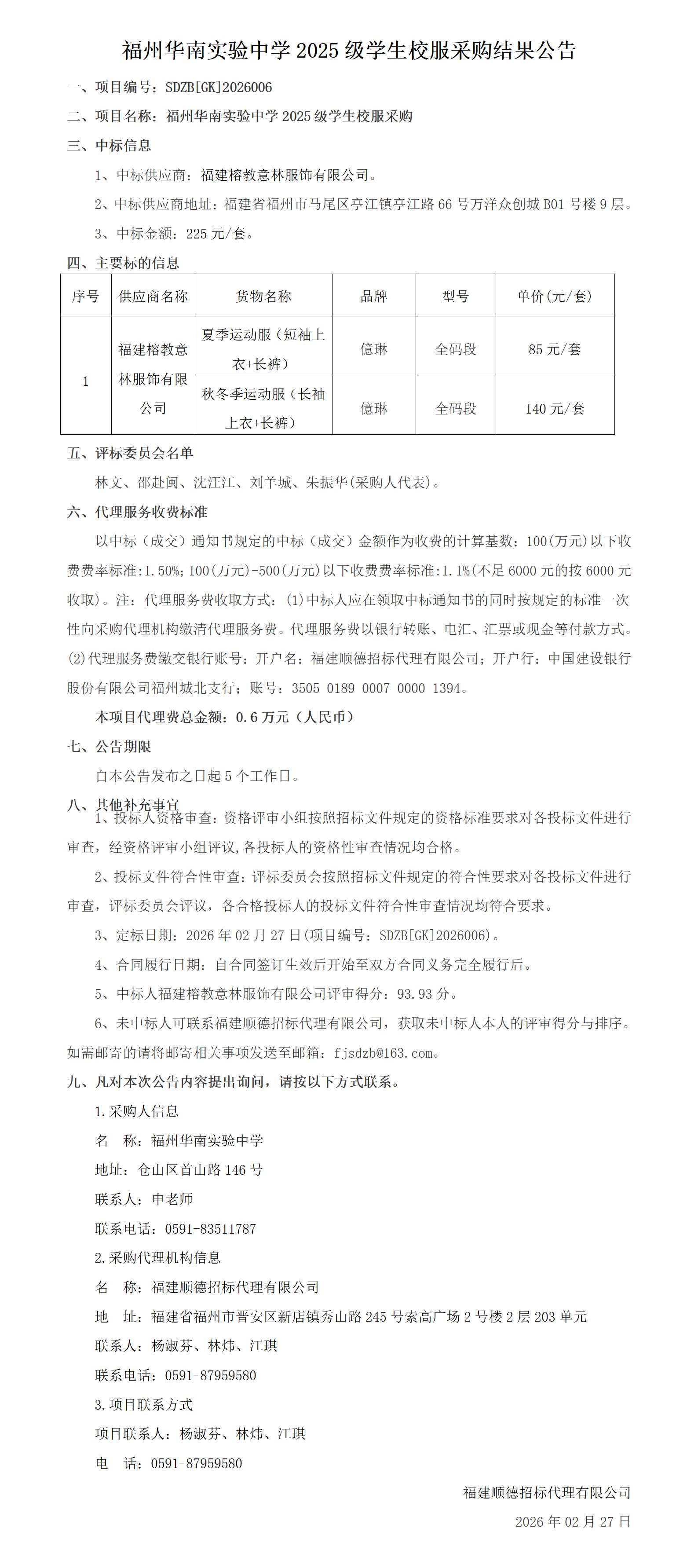 福州华南实验中学2025级学生校服采购结果公告